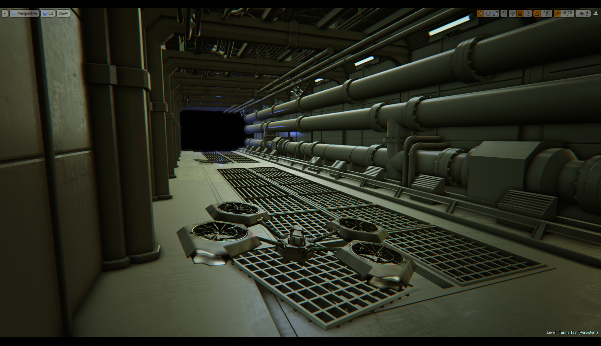 Sam’s been working on some initial environment mockups. Although they’re a work in progress they already create a strong sense of atmosphere and serve to display the style we are aiming for in the environments. The first two pictures are screenshots of the game running in editor, and for us it’s exciting to see the new quadcopter model in a nicer looking environment.